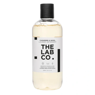 The Lab Co. Cashmere and Wool Laundry Detergent (300ml) is a plant-based, non-toxic formula made in the UK, designed to clean and care for delicate cashmere and wool fabrics with a comforting cinnamon, myrrh, and cedarwood scent, offering a gentle alternative to dry cleaning.