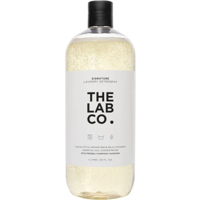 The Lab Co. Signature Laundry Detergent 1L is a vegan, cruelty-free, and non-bio concentrated formula, free from harsh chemicals for gentle yet effective cleaning, fragranced with lavender and orange rind, suitable for machine and hand wash, and delivers up to 64 washes per bottle.