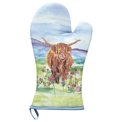 The Leonardo Collection Jennifer Rose Highland Cow Single Oven Glove Heat Resistant Kitchen Mitt Soft Cotton Cooking Stylish Design Perfect for Baking,