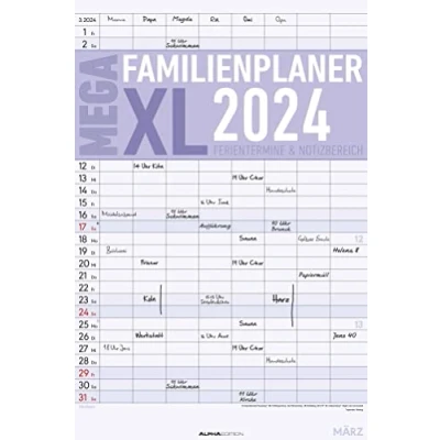 The Mega Family Planner XL 2024 with 8 Columns Timer 33 x 49.5 cm Offset Paper Holiday Dates Wall Alpha Edition