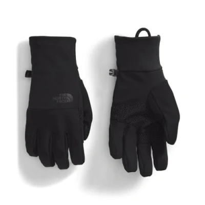 SkiwebshopThe North Face M Apex Etip Glove. Men's softshell ski gloves engineered for everyday use on the slopes and around the resort. Constructed from a stretch softshell with a C0 DWR, PFC-free water-repellent coating, these gloves shed light moisture while resisting the wind. The outer is 94% polyester and 6% elastane for a close, flexible fit. A fleece inner adds next-to-skin comfort and light thermal feel, while polyurethane reinforcement on high-wear areas improves grip and durability. Fingertips use Etip technology, so you can operate a smartphone or lift pass without removing the gloves. The softshell fabric combined with elastane delivers good dexterity for pole handling and other ski tasks. These gloves prioritise practical performance rather than heavy insulation, making them suitable for active use in cool to mild winter conditions. In short, the Apex Etip Glove is a practical, low-profile option for men who want wind resistance, water repellency and touchscreen compatibility in a comfortable softshell glove.