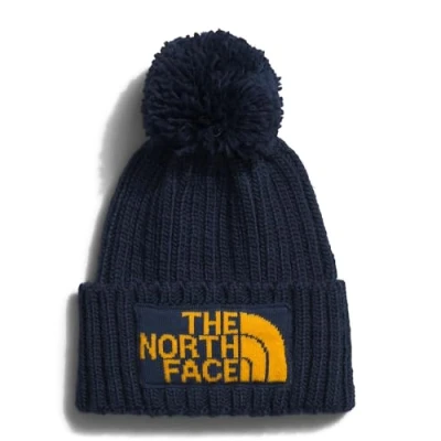Pompom top Knit logo patch Cuffed design Exaggerated rib