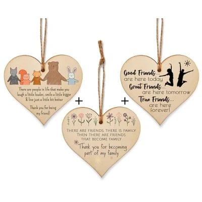 Set of 3 Handmade Heart Shaped Wooden Hanging Plaque Decorations The designs are unique and exclusive to the Plum Penguin. Hand illustrated and printed in full colour on the wooden hearts, to ensure a high quality durable finish. These make a great small gift for friends and family, and are a perfect alternative to a traditional greetings card. Size: 10 x 10 cm. Made from high quality sustainable 3mm Plywood (PEFC Certified) Includes a length of hessian twine for hanging. Each packaged in a transparent sleeve, these look smart and sleek to give as gifts. Fits neatly inside a card and envelope for posting.