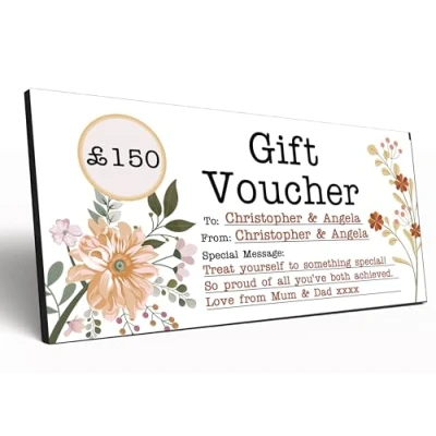 Customisable for Any Occasion π: Personalise your voucher for any event, whether itβs a holiday, birthday, or special celebration. Tailor the message and design to perfectly match the experience you're gifting. Premium Quality MDF π οΈ: Crafted from durable 6mm MDF, our vouchers are built to last. Size: 10 x 20cm. The smooth, high-quality finish provides a stylish look that can be displayed as a cherished keepsake. Packaged in a transparent sleeve, beautifully presentable as a gift, and ideal to send in the post. Versatile Gift Options π: Ideal for any type of gift, from concert tickets to driving lessons or a night out. A great addition to a monetary gift - add the amount. This voucher offers a unique and thoughtful way to present your gift. Elegant Cash Gift Voucher πΈ : Perfect for discreetly notifying recipients of monetary gifts for special occasions. Personalise this stylish voucher to add a heartfelt touch to your generous cash contribution. Memorable Keepsake π: Unlike traditional paper vouchers, this MDF plaque serves as a lasting memento of a special gift. Itβs a keepsake that can be treasured and displayed long after the gift has been enjoyed.