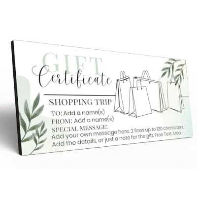 Stylish and Sustainable 🎉: Each voucher showcases a minimalist line drawing that corresponds to the specific activity chosen—from relaxing golf lessons to an exciting night at the theatre—making each gift unique and personal. The soft botanical leaf motifs in soothing greens enhance the visual appeal, making it not only a gift but a piece of art. Personal Touch ✏️: Customise your gift with 'To' and and 'From' names, and add a special message up to 120 characters to convey your sentiments perfectly. The use of sophisticated script and simple sans-serif fonts adds a level of refinement that is sure to impress your recipient. Versatile and Memorable 💖: This voucher is an ideal choice for those looking to give something unique, be it for birthdays, anniversaries, holidays, or just because. This voucher offers a thoughtful way to present your gift. Premium Quality MDF 🛠️: Crafted from durable 6mm MDF, our vouchers are built to last. 10x20cm. The smooth, high-quality finish provides a stylish look that can be displayed as a cherished keepsake. Packaged in a transparent sleeve, beautifully presentable as a gift, and ideal to send in the post. Shopping 🛍️: Treat someone special to a shopping spree with a custom-printed voucher. Ideal for birthdays, celebrations, or just because, this MDF voucher offers a stylish and lasting alternative to traditional gift cards.