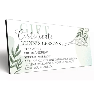 Stylish and Sustainable 🎉: Each voucher showcases a minimalist line drawing that corresponds to the specific activity chosen—from relaxing golf lessons to an exciting night at the theatre—making each gift unique and personal. The soft botanical leaf motifs in soothing greens enhance the visual appeal, making it not only a gift but a piece of art. Personal Touch ✏️: Customise your gift with 'To' and and 'From' names, and add a special message up to 120 characters to convey your sentiments perfectly. The use of sophisticated script and simple sans-serif fonts adds a level of refinement that is sure to impress your recipient. Versatile and Memorable 💖: This voucher is an ideal choice for those looking to give something unique, be it for birthdays, anniversaries, holidays, or just because. This voucher offers a thoughtful way to present your gift. Premium Quality MDF 🛠️: Crafted from durable 6mm MDF, our vouchers are built to last. 10x20cm. The smooth, high-quality finish provides a stylish look that can be displayed as a cherished keepsake. Packaged in a transparent sleeve, beautifully presentable as a gift, and ideal to send in the post. Tennis Lessons 🎾: Serve up the perfect gift with a custom tennis lessons voucher. Ideal for beginners or enthusiasts looking to improve their game, this MDF plaque makes the gift of skill development both stylish and thoughtful.