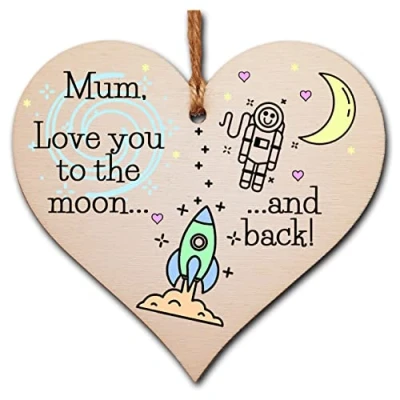 The Plum Penguin Handmade Wooden Hanging Heart Plaque for Mum loving thoughtful special keepsake cute cartoon space card alternative from children