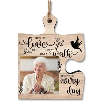 {Product Details} A specially designed, totally unique, decorative wooden hanging jigsaw puzzle piece. The design is unique and exclusive to the Plum Penguin. It was hand illustrated and is printed in full colour straight onto the wood. {Perfect as a Gift} Every puzzle piece plaque is packaged in a simple transparent sleeve, ready to gift. A one-of-a-kind, card alternative that is easy send in the post. Every jigsaw piece includes a length of rustic hessian jute string for hanging. {Cute Jigsaw Puzzle Shape} This beautifully crafted wooden tag, shaped like a jigsaw puzzle piece, serves as a heartfelt tribute to honor and remember a cherished loved one who has passed away. The design symbolizes the unique and irreplaceable role they played in your lives. {Materials & Size} Actual Size: 100mm (W) x 100mm (L). Shape: Jigsaw Puzzle Corner Piece. Made from durable 6mm MDF which feels sturdy and creates a smooth and vibrant printed finish. {Handmade in the UK} The puzzle piece is handcrafted in Birmingham, UK, by a small team dedicated to creating high quality, affordable decorations. Every order is cut, printed and packaged with care and attention to ensure the product reaches you in perfect condition.