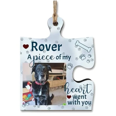 {Product Details} A specially designed, totally unique, decorative wooden hanging jigsaw puzzle piece. The design is unique and exclusive to the Plum Penguin. It was hand illustrated and is printed in full colour straight onto the wood. {Perfect as a Gift} Every puzzle piece plaque is packaged in a simple transparent sleeve, ready to gift. A one-of-a-kind, card alternative that is easy send in the post. Every jigsaw piece includes a length of rustic hessian jute string for hanging. {Cute Jigsaw Puzzle Shape} This beautifully crafted wooden tag, shaped like a jigsaw puzzle piece, serves as a heartfelt tribute to honor and remember a cherished family pet who has passed away. The design symbolizes the unique and irreplaceable role they played in your lives. {Materials & Size} Actual Size: 100mm (W) x 100mm (L). Shape: Jigsaw Puzzle Corner Piece. Made from durable 6mm MDF which feels sturdy and creates a smooth and vibrant printed finish. {Handmade in the UK} The puzzle piece is handcrafted in Birmingham, UK, by a small team dedicated to creating high quality, affordable decorations. Every order is cut, printed and packaged with care and attention to ensure the product reaches you in perfect condition.