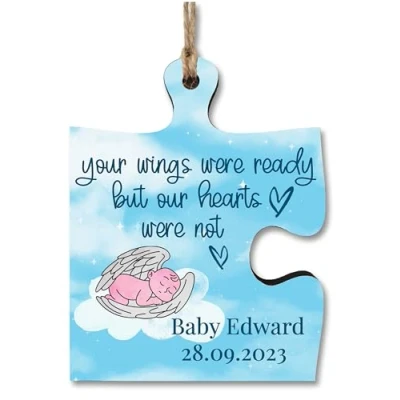 {Product Details} A specially designed, totally unique, decorative wooden hanging jigsaw puzzle piece. The design is unique and exclusive to the Plum Penguin. It was hand illustrated and is printed in full colour straight onto the wood. {Perfect as a Gift} Every puzzle piece plaque is packaged in a simple transparent sleeve, ready to gift. A one-of-a-kind, card alternative that is easy send in the post. Every jigsaw piece includes a length of rustic hessian jute string for hanging. {Cute Jigsaw Puzzle Shape} This beautifully crafted wooden tag, shaped like a jigsaw puzzle piece, is a heartfelt tribute designed to offer solace and remembrance to parents who have experienced the devastating loss of a baby. {Materials & Size} Actual Size: 100mm (W) x 100mm (L). Shape: Jigsaw Puzzle Corner Piece. Made from durable 6mm MDF which feels sturdy and creates a smooth and vibrant printed finish. {Handmade in the UK} The puzzle piece is handcrafted in Birmingham, UK, by a small team dedicated to creating high quality, affordable decorations. Every order is cut, printed and packaged with care and attention to ensure the product reaches you in perfect condition.