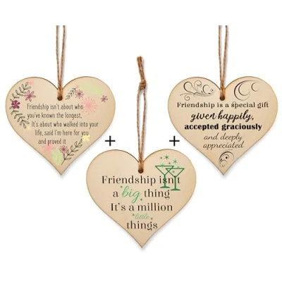 Set of 3 Handmade Heart Shaped Wooden Hanging Plaque Decorations The designs are unique and exclusive to the Plum Penguin. Hand illustrated and printed in full colour on the wooden hearts, to ensure a high quality durable finish. These make a great small gift for friends and family, and are a perfect alternative to a traditional greetings card. Size: 10 x 10 cm. Made from high quality sustainable 3mm Plywood (PEFC Certified) Includes a length of hessian twine for hanging. Each packaged in a transparent sleeve, these look smart and sleek to give as gifts. Fits neatly inside a card and envelope for posting.
