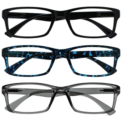 Three pairs of designer style reading glasses. Men's / women's / unisex. One pair in black finish, one pair in blue tortoiseshell finish and one pair in grey finish. Sturdy frame design with spring hinges. Strength +3.00.