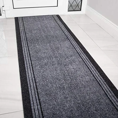 How to buy: This runner is sold and priced per foot, please select the length you require from the drop down box. Size: 2'2" (66cm) Wide - You choose the length you require. Depth: 5mm DESIGN CODE: Concorde Grey Skid resistant rubber backed runner rug suitable for all hard flooring. Samples are available upon request.