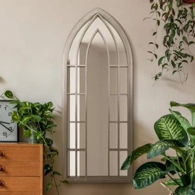 The Somerley Rustic Framed Arched Gothic Window Style Leaner Wall Mirror 59" X 24" (149CM 61CM) Stone Colour