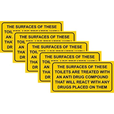 The surface of these toilets are treated with a compound that detects drug safety sticker Self adhesive vinyl 100mm x 50mm (Pack of 5) Remove backing film and apply to dry, smooth, oil free surface. Digitally printed and laminated for extra durability, Manufacturer: KPCM Display
