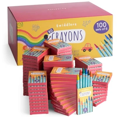 THE TWIDDLERS 100 Boxes of Wax Crayons for Kids, 6 Per Box, 600 Total Mixed Coloured, Perfect Mini Crayon Packs Party Bag Fillers, School Classrooms, Arts & Crafts, Restaurants