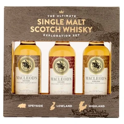 The Ultimate Single Malt Scotch Whisky Exploration gift set, including 3 x 5cl bottles of Macleod’s whisky. Perfect for Christmas and Birthdays. Premium Packaging.