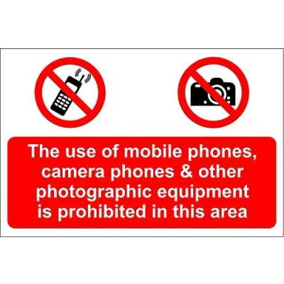 The use of mobile phones, camera phones & other photographic equipment is prohibited in this area sign 1.2mm Rigid plastic 200mm x 150mm