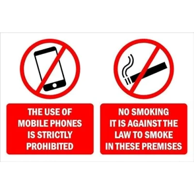 The use of mobile phones is strictly prohibited/ no smoking, prohibition sign. 1mm flexible Plastic sign. Digitally printed for extra durability. Drill and screw in position or use double sided tape to mount onto suitable surface. All signs come with a 5-year warranty. All our signs are UV resistant meaning they will not fade in sunlight. Suitable for indoor & outdoor use.