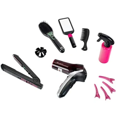 This mega set in the latest Braun design will turn your children's play room into an elegant salon The set includes a hair straightener, the Satin Hair 7 hair brush, a mirror, a comb, a spray bottle with water spray function and 4 hair clips At the press of a button, the little hairdryer blows out cold air – children will love using it but it never gets hot Children love setting up their own hair salon in the play room – and it helps to develop their fine motor skills and imagination through play Packaging dimensions: 49.5 cm x 8 cm x 26 cm I Suitable for children aged 3 years and up I Batteries required 2 x R03-AAA – not supplied with the product, Manufacturer: Theo Klein
