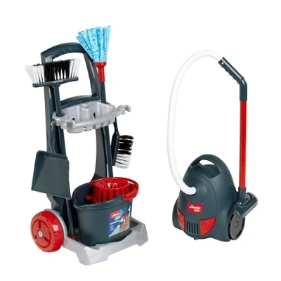 The Vileda cleaning trolley with vacuum cleaner and accessories delights little helpers Includes 7 pieces: bucket, mop, broom, hand brush, dustpan, vacuum cleaner, and cleaning trolley The vacuum cleaner with realistic sound provides authentic playtime fun Promotes motor skills, creativity, and the joy of helping around the house Dimensions: 38 cm x 24 cm x 70 cm | Suitable for children aged 2 and up, Manufacturer: Theo Klein