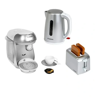 The set in Bosch design is the perfect complement to prepare a delicious breakfast in children's kitchens The set includes a toaster with mechanical toasting function and a leakproof and waterproof electric kettle Have fun with the modern Tassimo coffee machine, in which a pad can be inserted and filled with water, so that it runs through at the touch of a button Preparing and serving a cozy breakfast in your own play kitchen is fun and trains motor skills and imagination in a playful way Suitable for children aged 3 and over I Batteries required: 2 x R6-AA ' not supplied, Manufacturer: Theo Klein