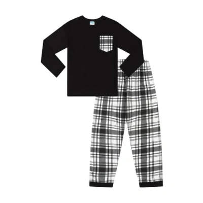 Boys Black and White Long Tartan Check Bottoms Pyjama Set. These come with a long sleeved top with a checked pocket and matching checked bottoms with an elasticated waist. This comfy set of pyjamas will make a superb gift, ideal for Christmas or birthdays Available in a variety of sizes - 7-8 Years, 8-9 Years, 9-10 Years, 10-11 Years, 11-12 Years, 12-13 Years, 13-14 Years, 14-15 Years, 15-16 Years