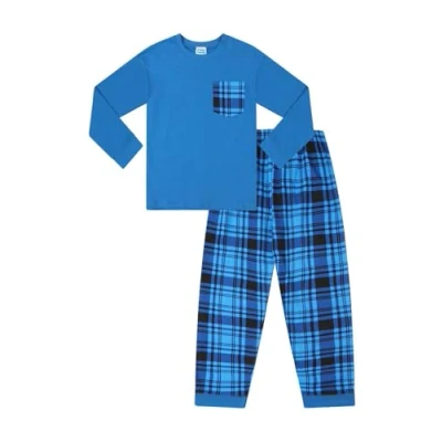 Boys Blue Long Tartan Check Bottoms Pyjama Set. These come with a long sleeved top with a checked pocket and matching checked bottoms with an elasticated waist. This comfy set of pyjamas will make a superb gift, ideal for Christmas or birthdays Available in a variety of sizes - 5-6 Years, 6-7 Years, 7-8 Years, 8-9 Years, 9-10 Years, 10-11 Years, 11-12 Years, 12-13 Years, 13 Years, 13-14 Years, 14-15 Years, 15-16 Years Keep Away From Fire - Low Flammability to EN 14878