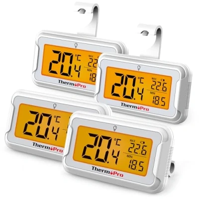 【Wide Range & High Accuracy】Measures from -20°C to 50°C with +/-0.5℃ precision, covering all household and commercial needs (deep freezers, grocery displays, fermenting). Compact size, yet robust for long-term use 【Easier to read】The oversized LCD screen with bright backlight ensures easy readability, even in dark freezers or low-light conditions. Say goodbye to squinting while checking your fridge temperature 【Easier to use】This fridge temperature monitor can adapt to any space with 3 placement options: Magnetic/Hanging/Standing. Features a coin-twist battery compartment (no screwdrivers needed) for 5-second swaps 【Superior Waterproof】Engineered with IPX6-rated waterproof, this thermometer for fridge runs safely and reliably over time, making it ideal for refrigerators, freezers, and even damp environments like basements or wine cellars 【Max/Min Temp Recording】Keep track of temperature fluctuations with the built-in max/min record function, allowing you to easily view the max/min temp in the past 24 hours from the cooler thermometer. This feature helps you monitor sudden changes in your fridge, ensuring food safety.