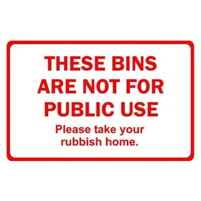 These bins are not for public use prohibition sign. Self adhesive sticker. Printed using the latest digital technology and laminated for extra durability. Remove backing film and apply to dry, smooth, oil free surface. All signs come with a 5-year warranty. All our signs are UV resistant meaning they will not fade in sunlight. Our vinyl stickers are temperature resistant from -40°C to +80°C.