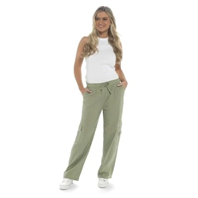 CLASSIC DESIGN: Stay comfortable and stylish in our ladies’ linen blend cargo pants! Made from a soft linen mix, these full-length pants are perfect for everyday wear. The convenient side pockets add a functional touch to this chic wardrobe staple. Easy-to-wear and super comfortable they are ideal as workwear, for casual occasions or as holiday wear COMFORTABLE: Relaxed fit with elasticated waist and matching drawstring tie, these soft woven pants, with pockets on the outer side of each leg, and two side pockets, can be pulled on easily and look great all day long. Linen is very strong, absorbent, and dries faster than cotton - perfect to wear in warmer weather HIGH QUALITY: Made from linen blended with viscose, these trousers have the benefits of linen with the addition of viscose, which is hard wearing, helps improve the drape of the fabric, and reduces wrinkling THE DETAILS: Full Length linen blend cargo trousers with elasticated waist and matching drawstring tie. Two pockets on the outer side of each leg. Two side pockets. 70% Viscose, 30% Linen. Inside leg 73cm (29” approx.) - Size 16 measured. Machine Washable RANGE OF COLOURS AND SIZES: Available in Colours Light Khaki, Navy or Stone, and UK Sizes 10, 12, 14, 16, 18, 20