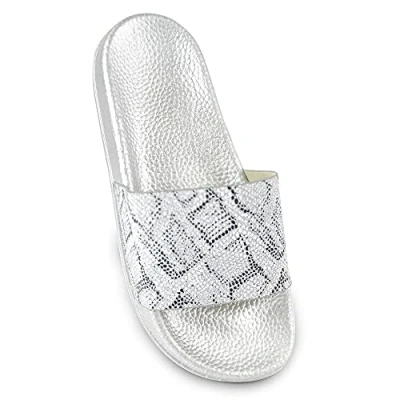 Treat your feet to a bit of elegance with these exotic Ladies Snake Print Pool Slides. Featuring luxurious python printed details and glitter sparkle, these sandals make for the perfect addition to any holiday outfit, whether you're heading to the beach, the pool, or anywhere in between. Embrace your wild side and show off your unique style with these chic sparkly slides Comfortable thick-soled lightweight non-slip sliders with soft synthetic glittery snake-patterned cuff These sparkly slip-on sliders are ideal for wearing on the beach or round the pool, yet stylish enough for everyday wear Perfect for teenagers or adults - for holidays, everyday use or as slippers Available in colours Black or Silver and UK Shoe Sizes 3-8