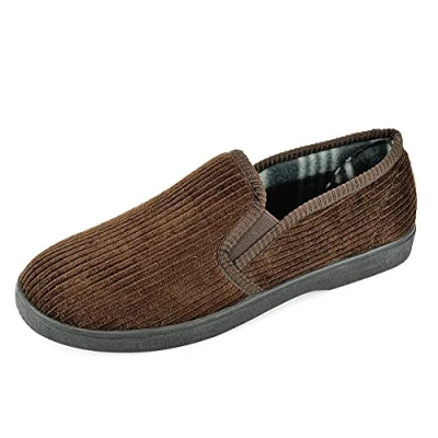 Cozy up this winter with these classic mens traditional brown cord slippers. A luxurious tartan patterned fleece lining keeps feet warm and comfortable on those cold nights, while a non-slip sole ensures steady footing. With a classic twin gusset slip-on design, these slippers make an ideal present for Christmas or any winter occasion Soft brown jumbo cord uppers with twin elasticated gussets that ensure the slippers stay in place but are easy to slip-on and -off Black and white checked fleece lining with cushioned insoles Sturdy but flexible non-slip black soles Available in UK Shoe Size 7, 8, 9, 10, 11, 12