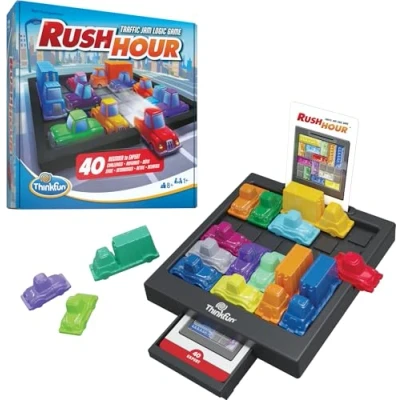 Original Rush Hour traffic jam logic game: your mission is to escape by sliding vehicles and clearing the exit for the red car. 40 challenges from beginner to expert: set up each puzzle and move cars and trucks to create a clear route to freedom. STEM brain teaser for ages 8+: builds problem solving, logical reasoning and planning skills—great screen-free solo play or family challenge time. Box contents: 40 challenge cards, 1 red car, 15 blocking vehicles and easy instructions for quick set-up and portable play. From ThinkFun: award-winning logic puzzles and brain games that stretch and sharpen the mind—ideal gift for kids, teens and adults., Manufacturer: Ravensburger