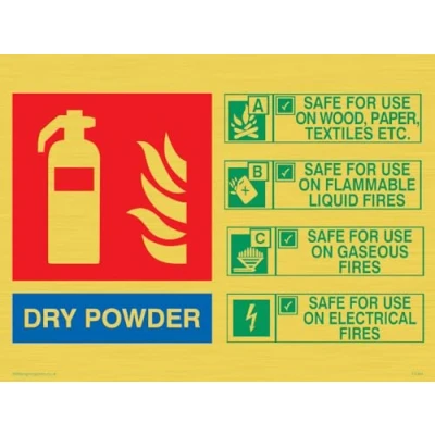 No Symbol This sign is made from vinyl gold sticker Gold metal effect sticker for flat, clean surfaces. Not for rough, plastic, or dusty surfaces. A5 landscape Sign Text: This extinguisher contains Dry Powder instructions for use Sign
