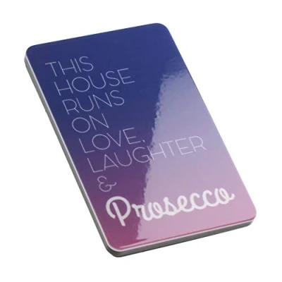 Perfect gift for Birthdays, Christmas or any other occasion Fun, bold design featuring funny ‘This House Runs on Love, Laughter and Prosecco’ message Crafted from thick acrylic, this strong magnet will be a fun and colourful addition to your fridge Dispatched with presentation card as shown Unique design created in Wales