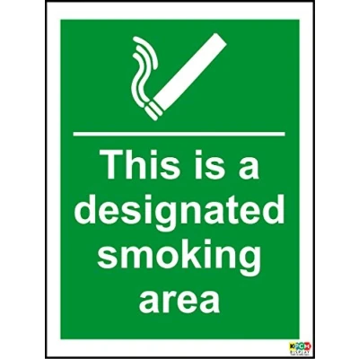 This is a designated smoking area Sign 1mm rigid PVC self adhesive backing 200mm x 300mm Digitally printed and laminated for extra durabillity Remove backing film and apply to dry, smooth, oil free surface.
