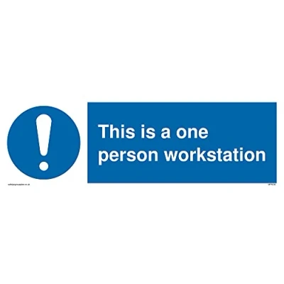 M001 : General mandatory action This sign is made from vinyl high tack A stickier sticker. Uses a stronger adhesive to make it more suitable for plastic surfaces like Wheelie Bins or where the sticker might get rubbed. 31 landscape Sign Text: This is a one person workstation with mandatory symbol