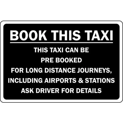 This taxi can be pre booked ask driver for details sign Self adhesive sticker Digitally printed and laminated for extra durability Remove backing film and apply to dry, smooth, oil free surface.