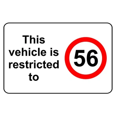 This vehicle is restricted to 56 mph Car speed restriction sign Self adhesive sticker (200mm x 150mm)