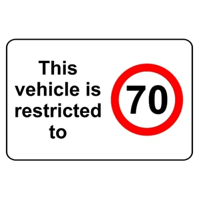 This vehicle is restricted to 70 mph Car speed restriction sign Self adhesive sticker (200mm x 150mm)