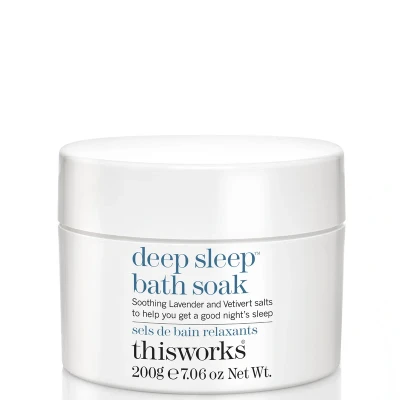 This Works Deep Sleep Bath Soak 200g contains a natural blend of Lavender, Vetivert, and Wild Camomile to calm nerves, moisturize skin, and create a relaxing atmosphere for restful sleep. Its award-winning formula is perfect for unwinding before bedtime.