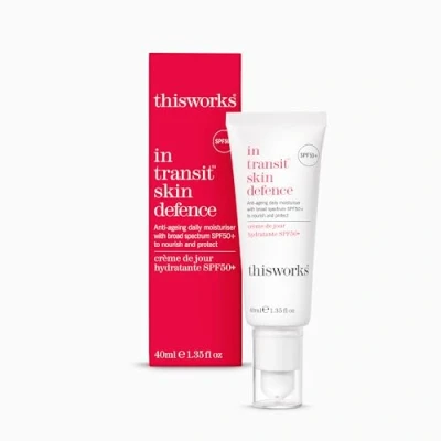 This Works In Transit Skin Defence SPF50+ Face Moisturiser (40ml) with Hyaluronic Acid, Vitamin E and Antioxidants Anti Aging Daily Sunscreen Lotion for Broad Spectrum UVA/UVB Protection