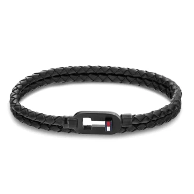 Double-wrap bracelet for men by Tommy Hilfiger Material: Black leather and stainless steel closure with black Ion Plating (IP) Inner circumference: 19 cm Embellished with Enamel Tommy Hilfiger Flag on the closure Closure: Sliding notch