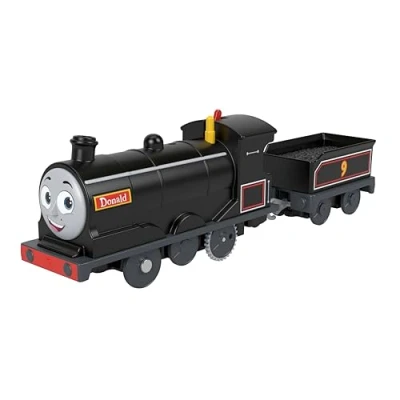 Kids can race into fun stories with this motorized toy train featuring Thomas & Friends character Donald, the number 9 engine Press the switch on top of the engine to send Donald racing along with his cargo car of coal Engine comes with plastic connectors to attach to other Thomas & Friends trains, vehicles, cargo cars or tenders. (Additional vehicles and play pieces sold separately and subject to availability.) This toy train is compatible with all Thomas & Friends track, except wood. (Track sets sold separately and subject to availability.) Helps strengthen fine motor skills and encourage imaginative storytelling play for preschool kids ages 3 years and older, Manufacturer: Mattel