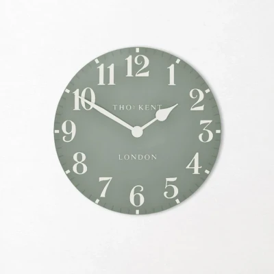 Thomas Kent 20-inch wall clock, featuring a round, traditional design with chalk white Arabic numerals and hands against a soft green backdrop. Diameter: 51cm Projection: 4.4cm Quartz movement with audible tick The Thomas Kent wall clock is a stunning blend of tradition and modernity. Its round, heritage-inspired design features elegant chalk white numerals and hands, perfectly contrasted against a gentle green backdrop. The signature curvaceous dial adds a touch of timeless sophistication, making this clock a refined centrepiece for any wall. With its harmonious mix of classic elements and contemporary hues, this clock offers versatility that complements a wide range of interiors. Whether displayed in a living room, kitchen or bedroom, the Thomas Kent wall clock is more than a timepiece—it’s a statement of style and charm.