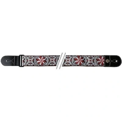 50 mm wide textile strap with woven jacquard pattern Smooth leather ends, reinforced strap button hole, metal strap mountings Length adjustable 83 - 143 cm, design: red white