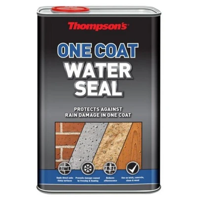Roofing SuperstoreThompson's One Coat Water Seal uses a unique micro silicone emulsion to stop water penetration. Apply just one coat of Water Seal directly onto damp surfaces to provide long lasting waterproof protection within hours. What are the features of Thompsons One Coat Water Seal? , Apply directly onto damp surfaces , Stops damage caused by freeze and thaw , Use on brick, concrete and stone , Reduces efflorescence Technical Coverage: Approx. 4m2 per litreColour: ClearDry time: 2 hoursTin size: 1L. Thompsons One Coat Water Seal - 1L Thompson's