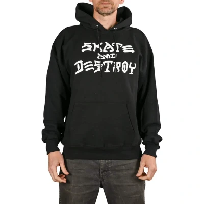 * Thrasher Skate And Destroy hoodie has a typical pullover hooded sweater build, with a classic "Skate And Destroy" graphic print on the centre of the chest. * Featuring a black cotton-poly fabrication and contrast white print. * Elasticated and ribbed hem and cuffs * Drawstring in the hood to adjust tightness when worn * Double-entry pouch style pocket * 90% Cotton, 10% Polyester * Fit is regular-box * Model is 5’10" tall and of medium build, wearing a size medium