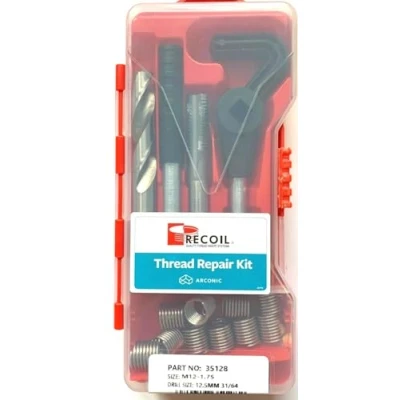 General description Recoil 35128 Metric Thread Repair Kit is designed for repairing damaged threads or creating stronger original threads in alloys and composite materials. This kit is particularly useful in original equipment manufacturing and allows for a seamless changeover between unified and metric threads. Technical specifications Thread size: M12.0 Pitch: 1.75 Insert length: 1.5 times the diameter Material: Corrosion-resistant stainless steel Other information Includes a quality HSS tap, installation tool, precision stainless steel inserts, and instructions. Supplied in a sturdy container. Not supplied with a tapping drill.